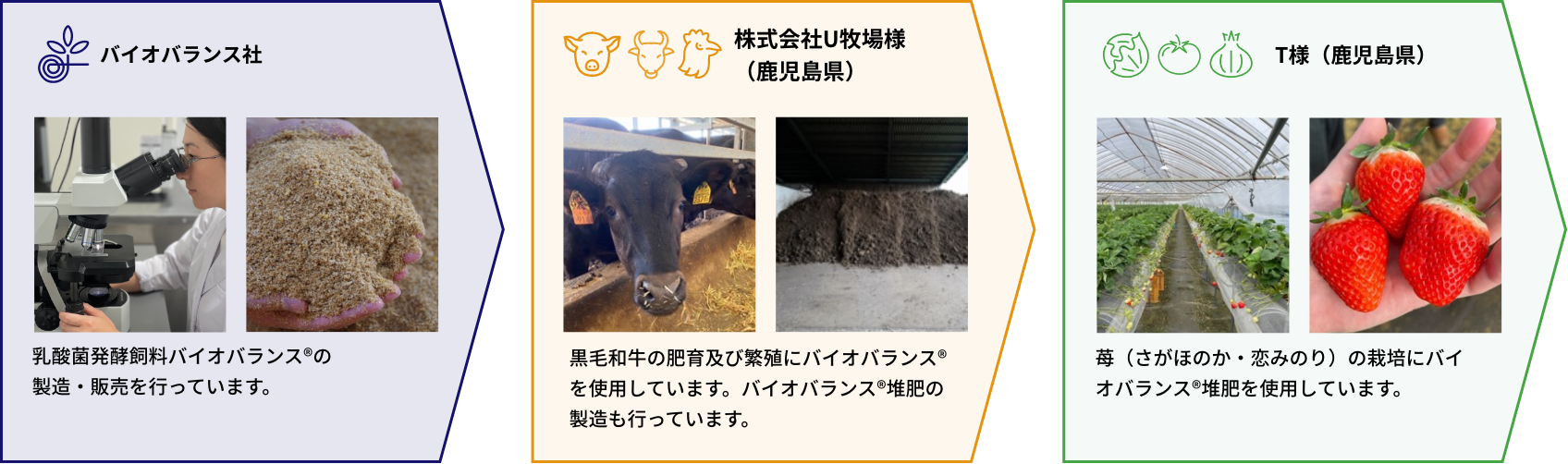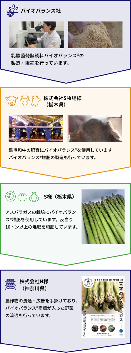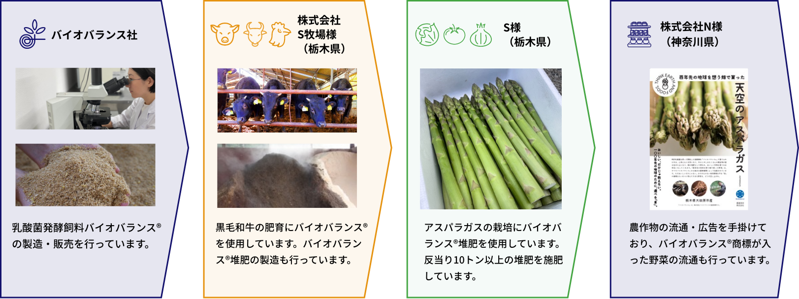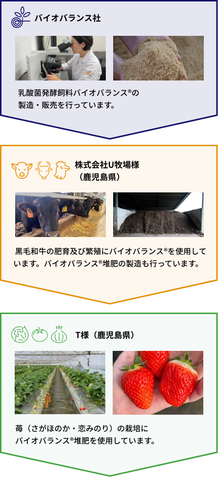 そして、「バイオバランス®」や「バイオバランス®堆肥」を用いて生産される農畜産物は、乳酸菌をはじめとする微生物の力で育まれた食材として流通され、食する人々に届けられます。
